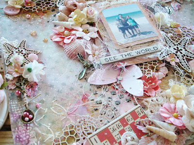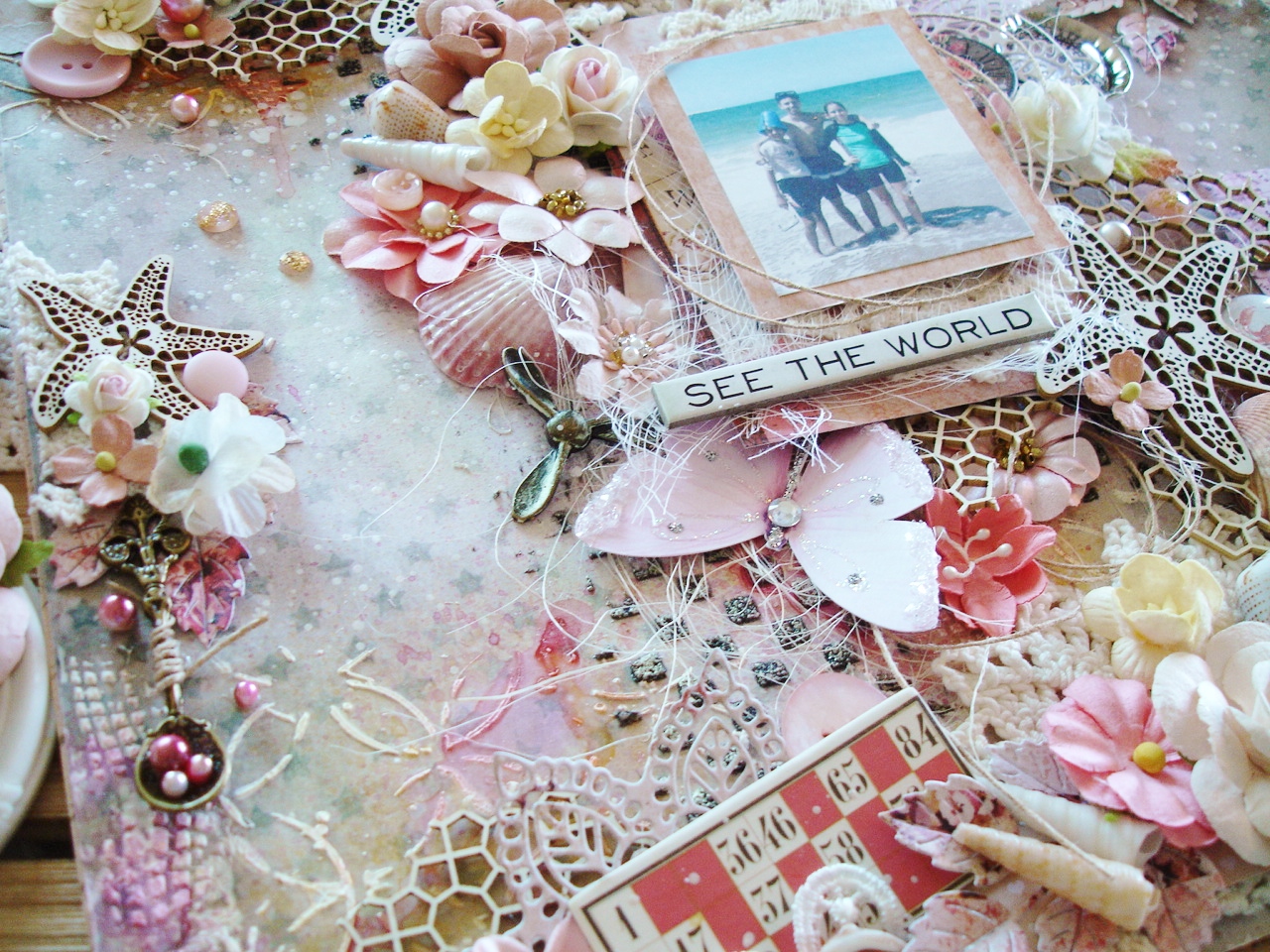 I used ReneaBouquets Beautiful Board Chipboard, ReneaBouquets Handcrafted Butterflies, Art Anthology Lotus Stencil and Cuts2luv Badges! Of course lots of Prima flowers and Prima Color Bloom Sprays.